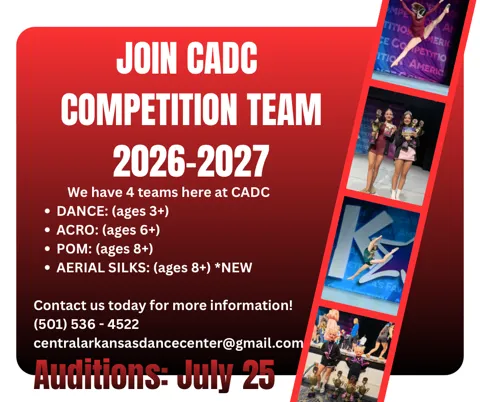Central Arkansas Dance Center offers a wide range of dance classes and programs, including: Ballet & Pointe, Jazz & Tap, Hip-Hop, Lyrical & Contemporary, Musical Theatre, Acro, Aerial Silks & Lyra, Adult Ballet & Adult Aerial Silks, Competition Teams, EveryBODY Dances (special needs program).